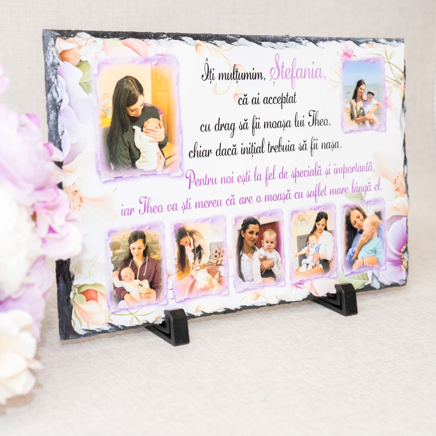 Placă din ardezie cu 7 poze și mesaj - Mov