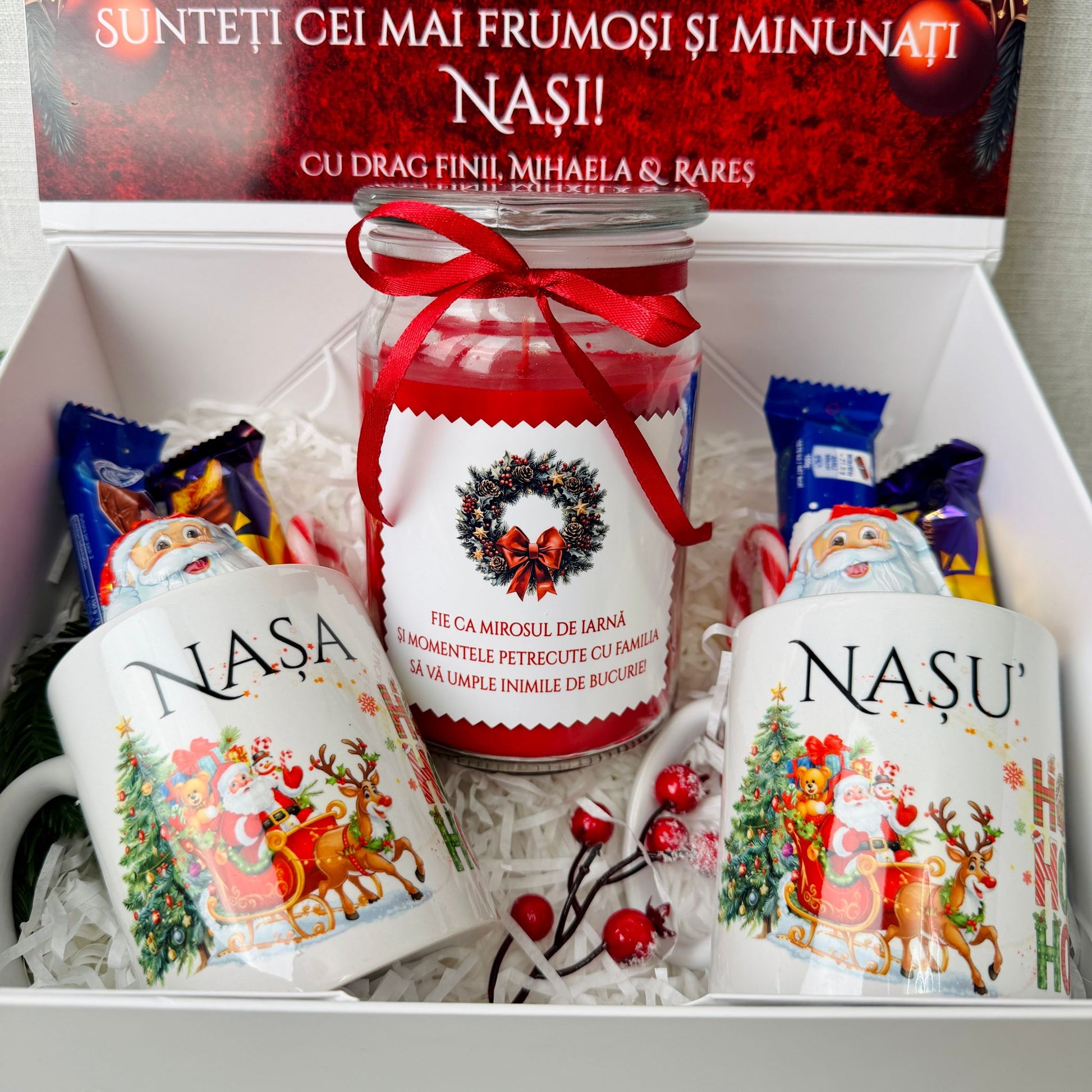 Cutia conține: 2 căni pentru NAȘA și NAȘUL umplute cu dulciuri și o lumânare.
