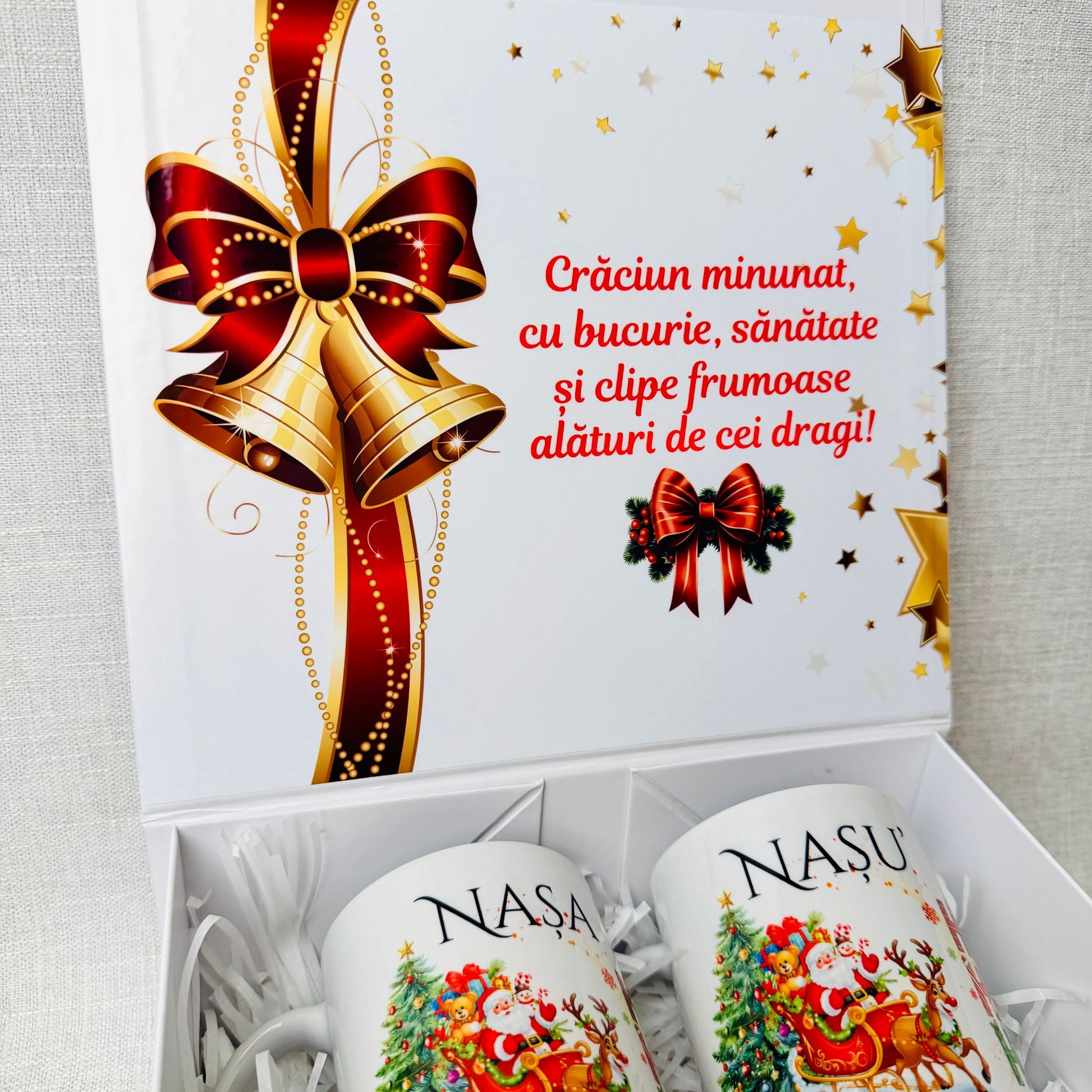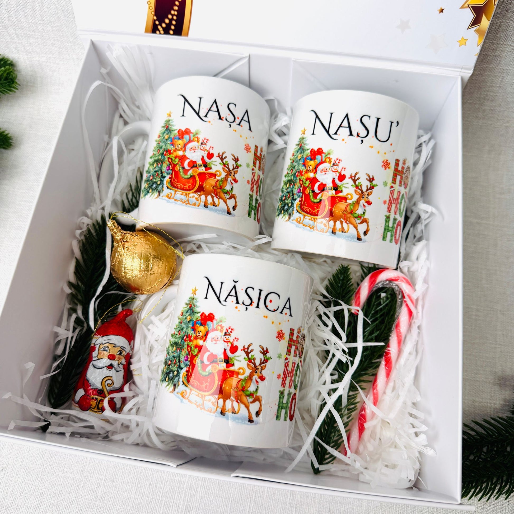 🌟Cutia conține: 3 căni pentru NAȘA, NAȘUL ȘI NĂȘICA, 2 ciocolate festive (glob și Moș Crăciun) și o acadea bastonaș.