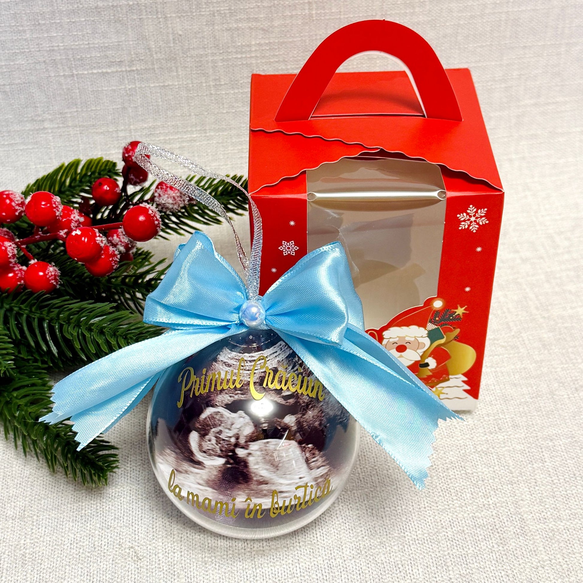 Globul personalizat cu ecografia este realizat din plastic rezistent, are un diametru de 8 cm și este accesorizat cu o fundă elegantă și o pietricică decorativă care îi oferă un aspect elegant și festiv, creat special pentru viitorii părinți!