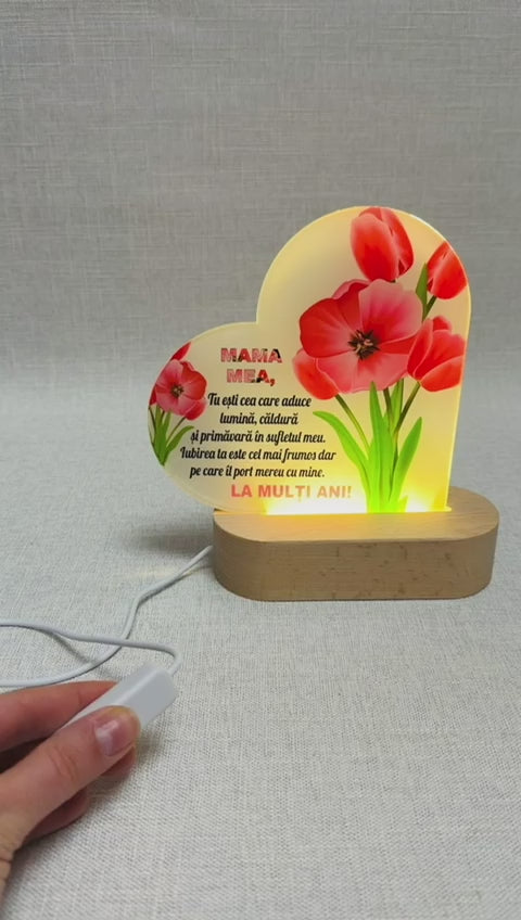 Această lampă LED decorativă, în formă de inimă, este realizată din acryl de calitate, imprimat cu lalele roz și un mesaj special dedicat mamei. Designul elegant este completat de un suport din lemn natural, care oferă stabilitate și un aspect modern, potrivit oricărui decor.