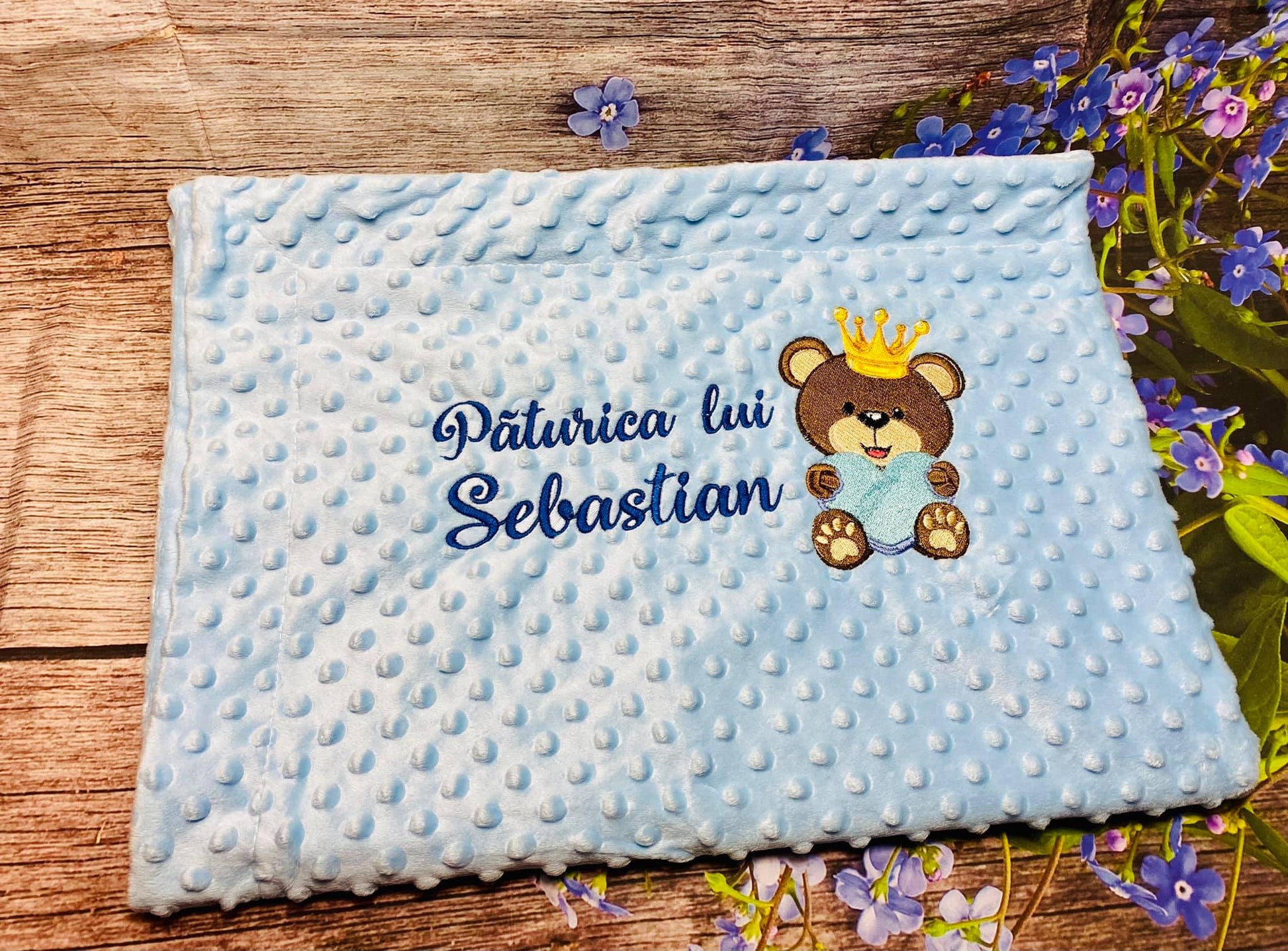 Păturică moale și pufoasă, brodată cu numele copilului și un adorabil ursuleț. Creată pentru a oferi confort și căldură, această păturică devine o amintire specială pentru cei mici.