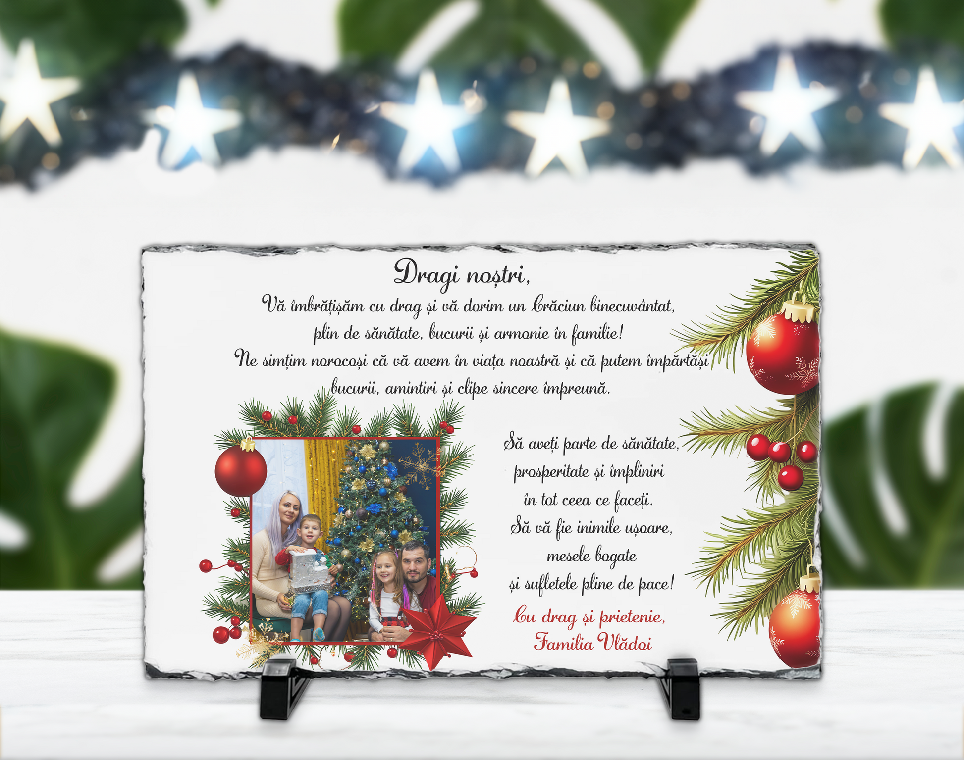Caracteristici produs: Material: ardezie naturală, durabilă și elegantă. Personalizare: mesaj text la alegere + design tematic de sărbători + o fotografie. Dimensiune: A4 (21 x 29,7 cm), potrivită pentru expunere pe birou, raft sau perete.