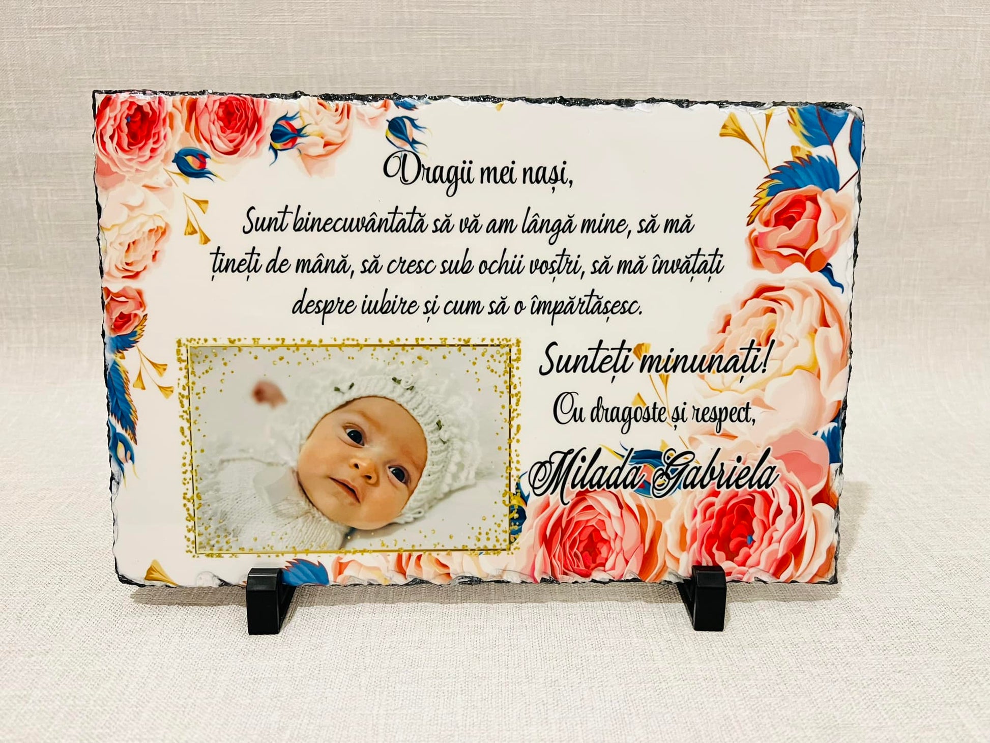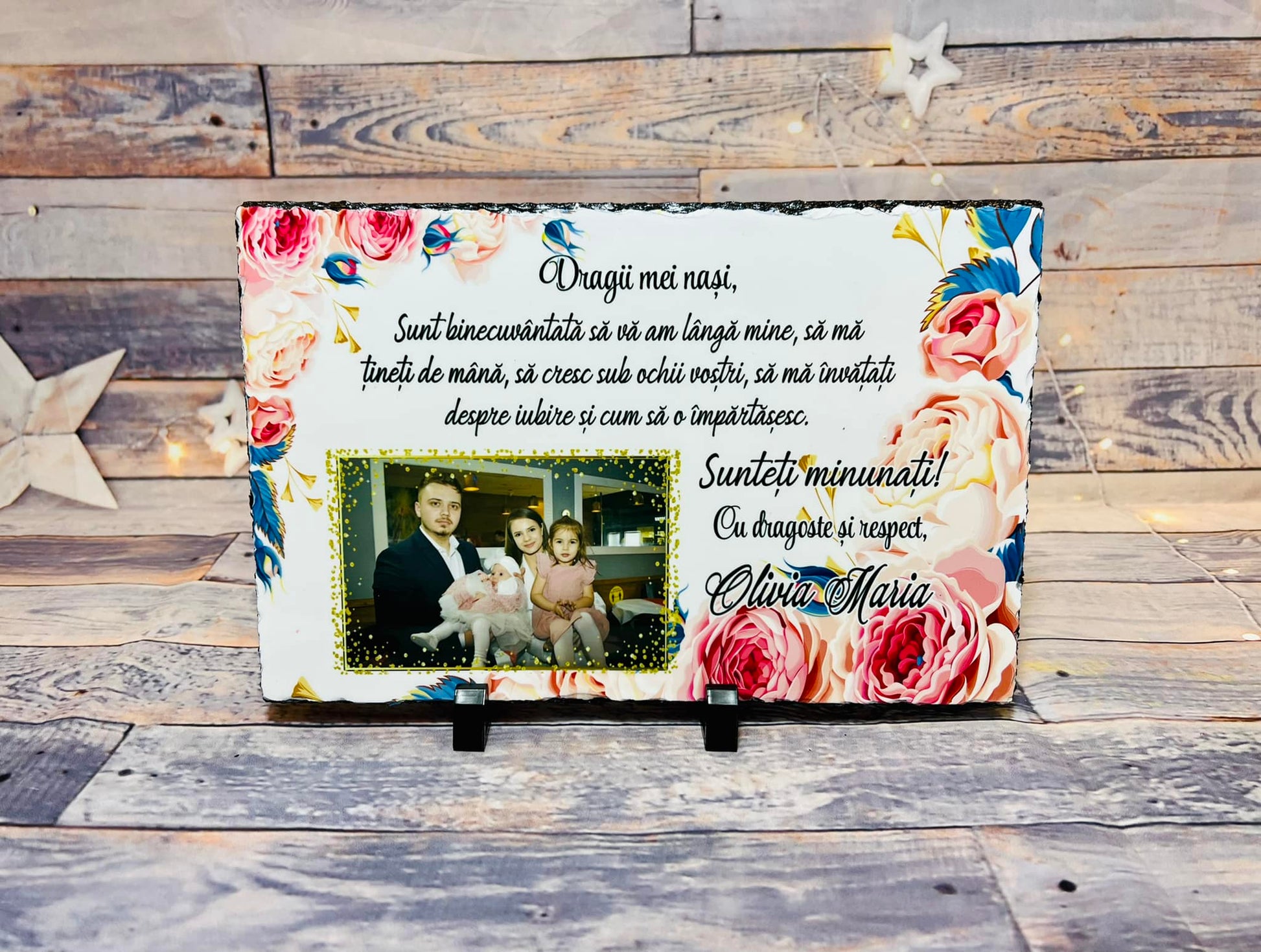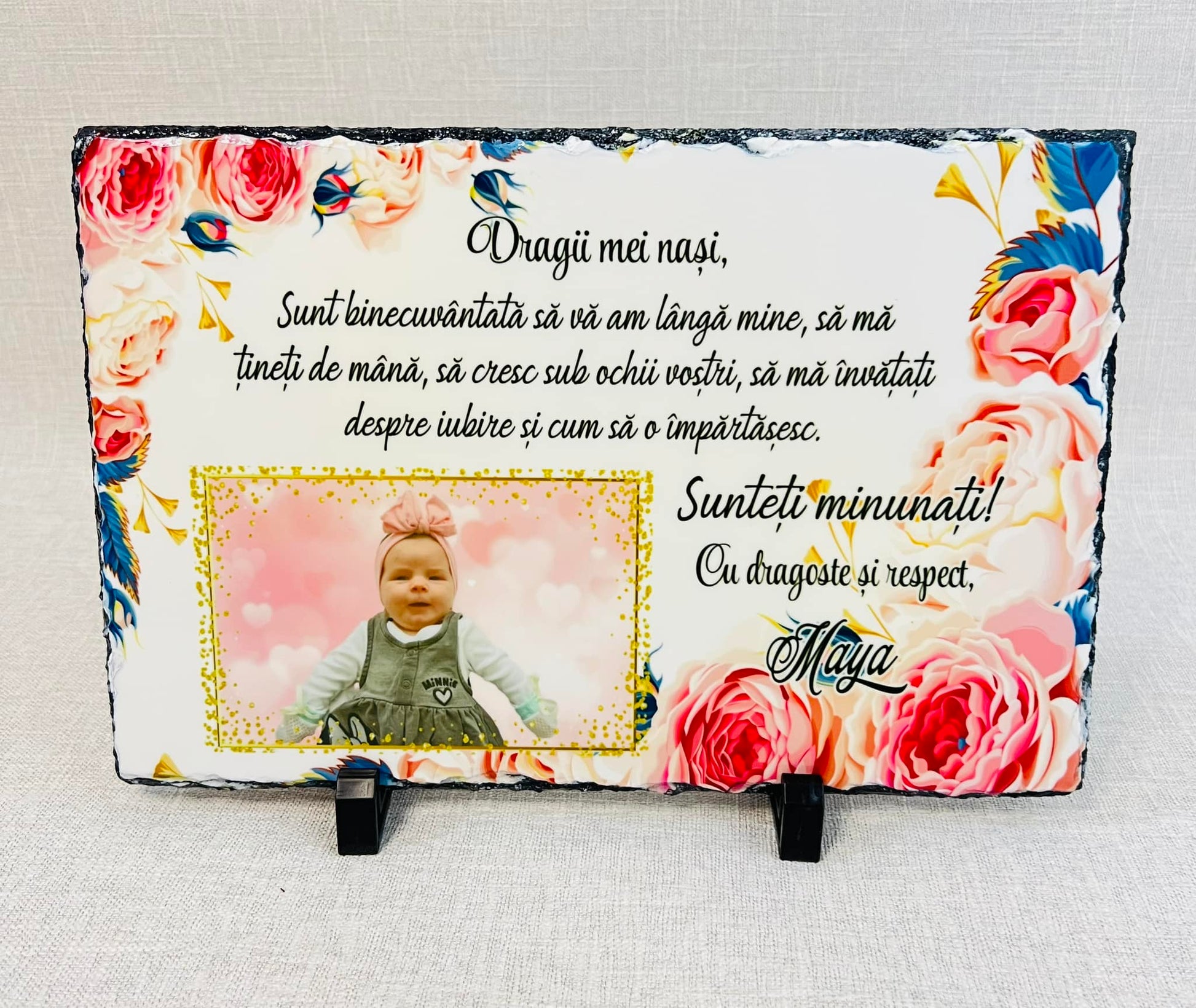 Caracteristici produs: Material: ardezie naturală, durabilă și elegantă. Personalizare: o fotografie + mesaj text la alegere. Dimensiune: A4 (21 x 29,7 cm), potrivită pentru expunere pe birou, raft.
