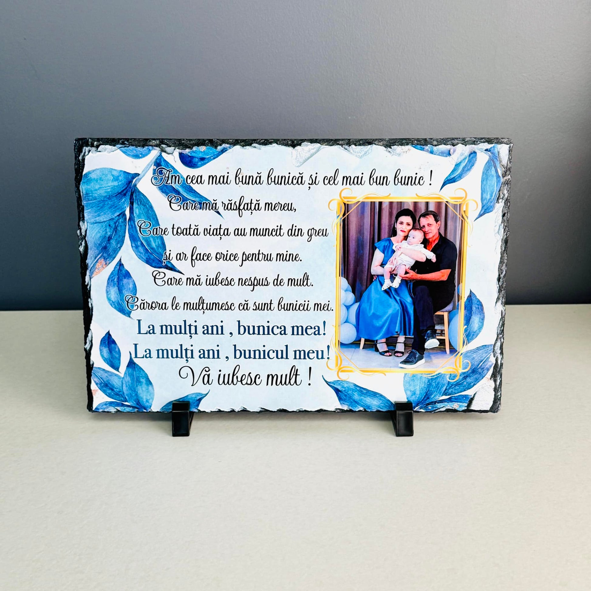 Caracteristici produs: Material: ardezie naturală, durabilă și elegantă. Personalizare: o fotografie + mesaj text la alegere. Dimensiune: A4 (21 x 29,7 cm), potrivită pentru expunere pe birou, raft.
