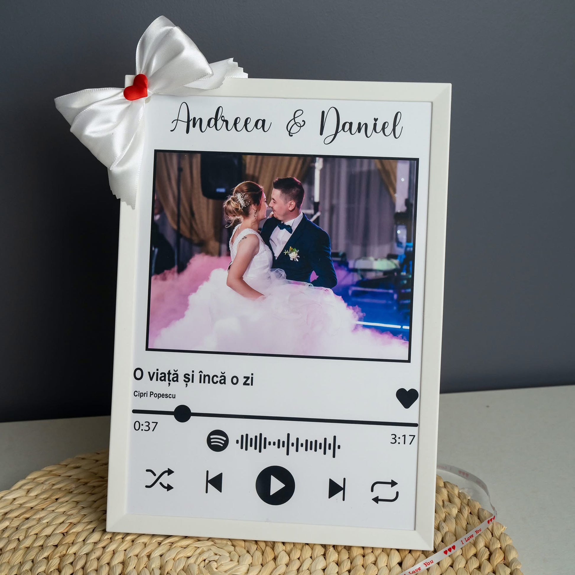 Transformă melodia și fotografia ta preferată într-un suvenir unic! Această ramă personalizată este concepută în stilul unui player muzical, incluzând fotografia aleasă, titlul piesei, numele artistului și chiar un cod Spotify care poate fi scanat pentru a reda instant melodia. Decorată cu fundiță din satin și detaliu inimă, este un cadou romantic și plin de semnificație pentru persoana iubită.