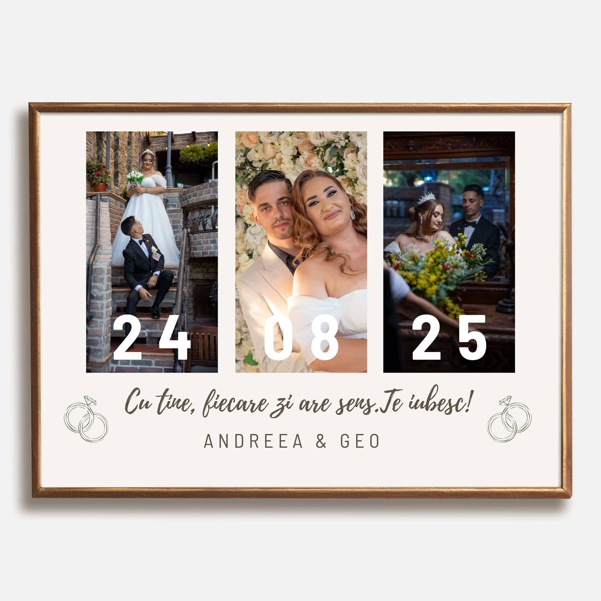 Păstrează amintirile prețioase într-o ramă personalizată cu 3 fotografii, data nunții, numele voastre și un mesaj emoționant.