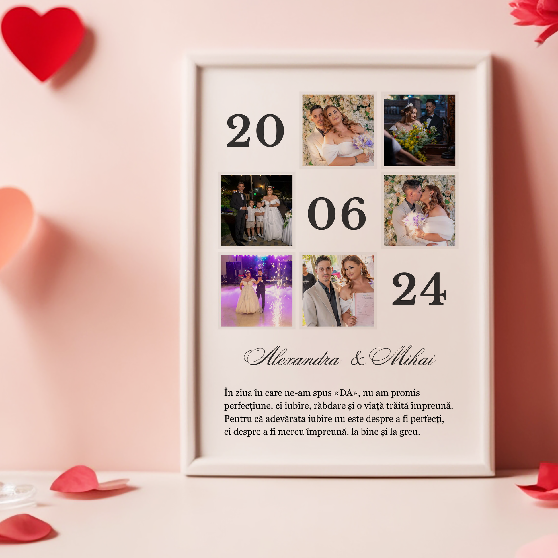 Păstrează amintirile prețioase într-o ramă personalizată cu 6 fotografii, data nunții, numele voastre și un mesaj emoționant.