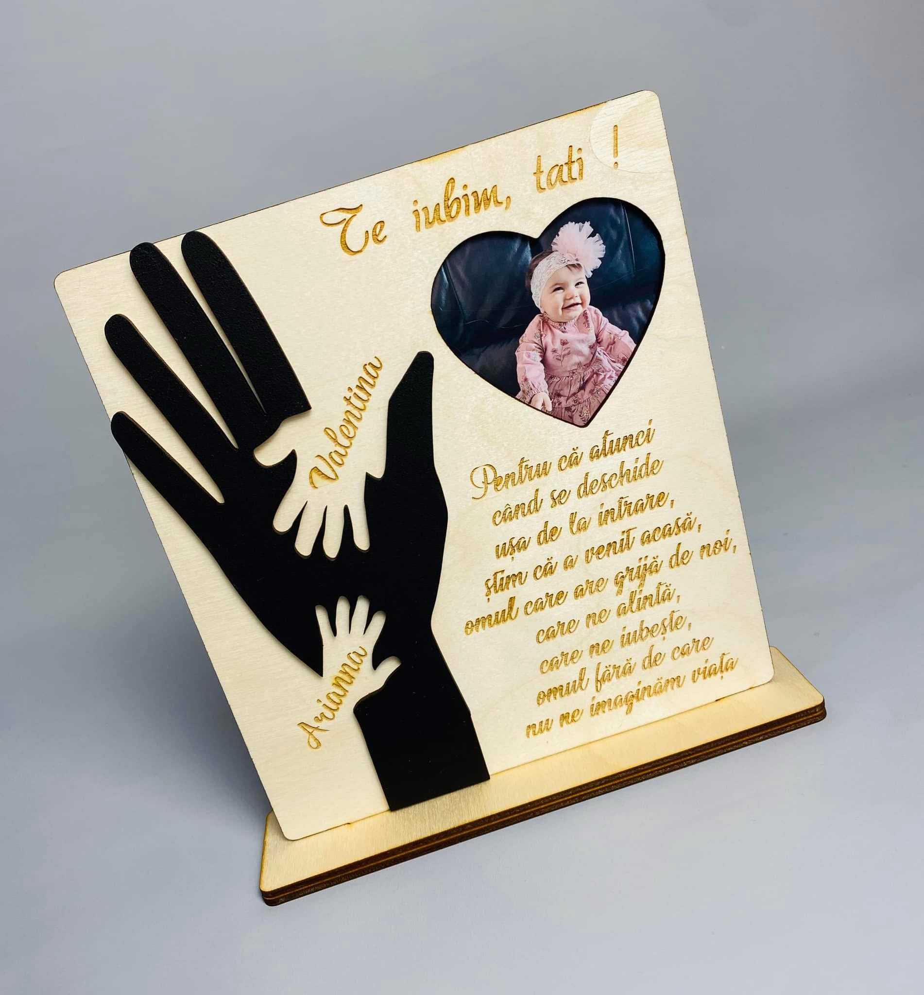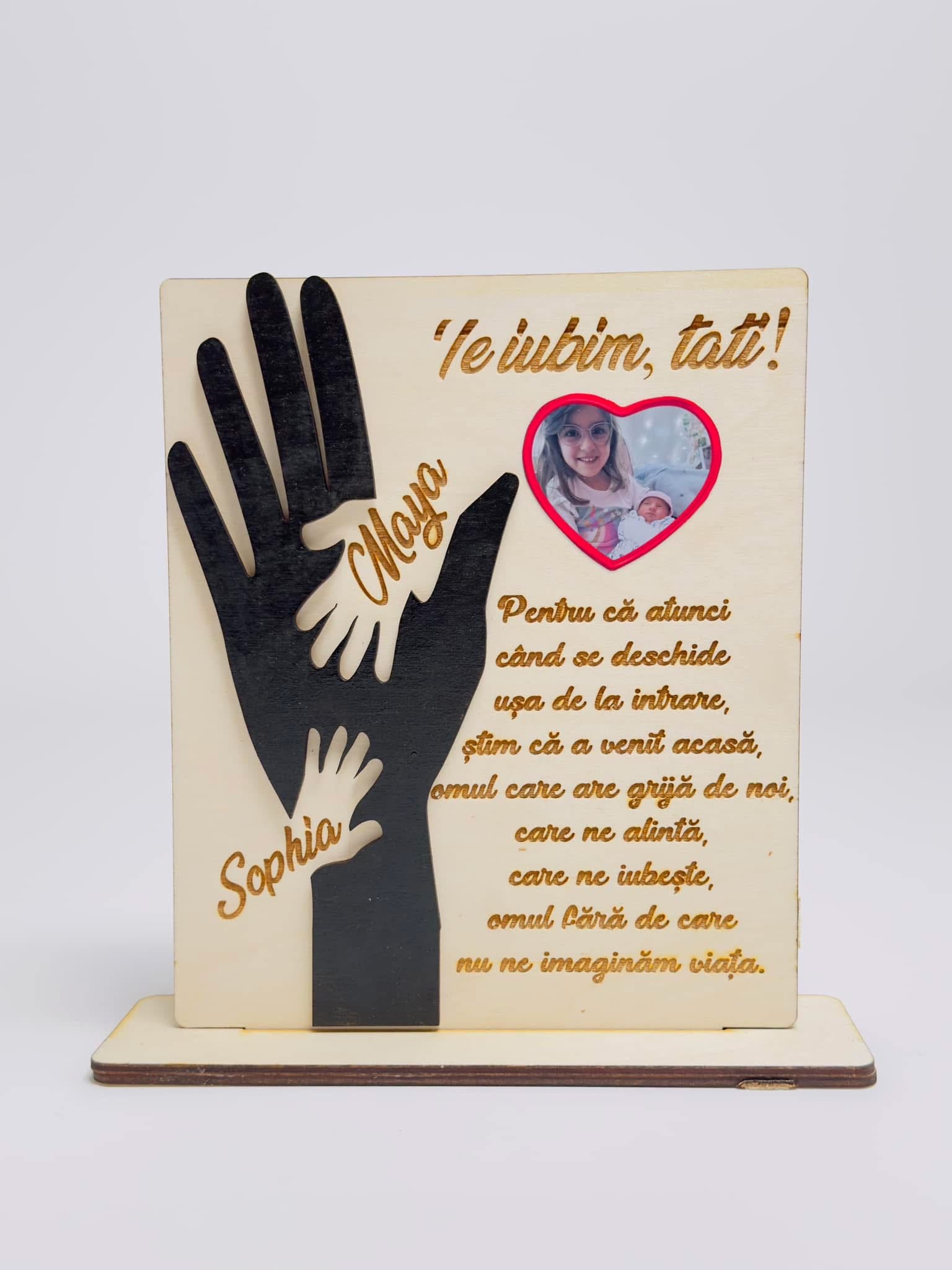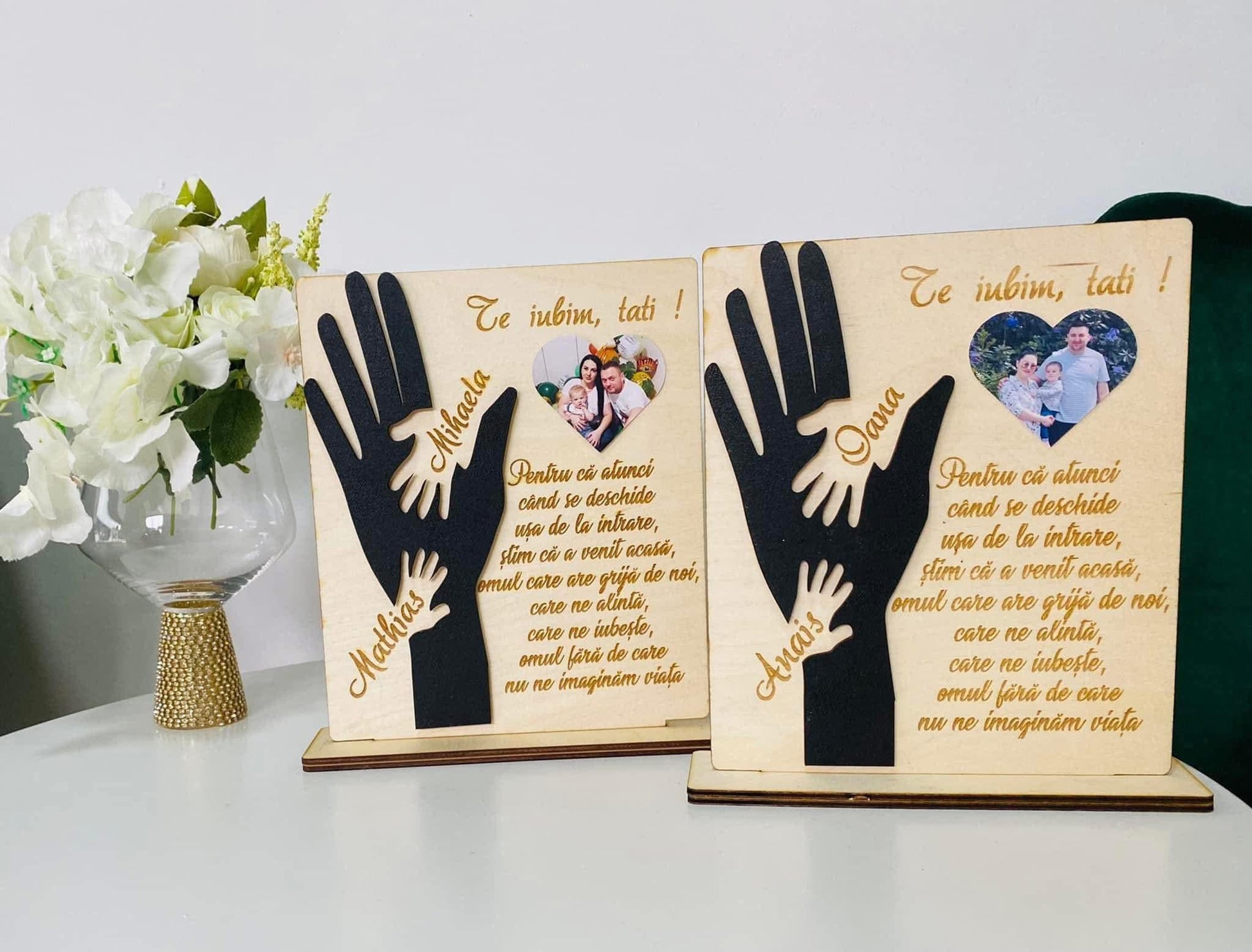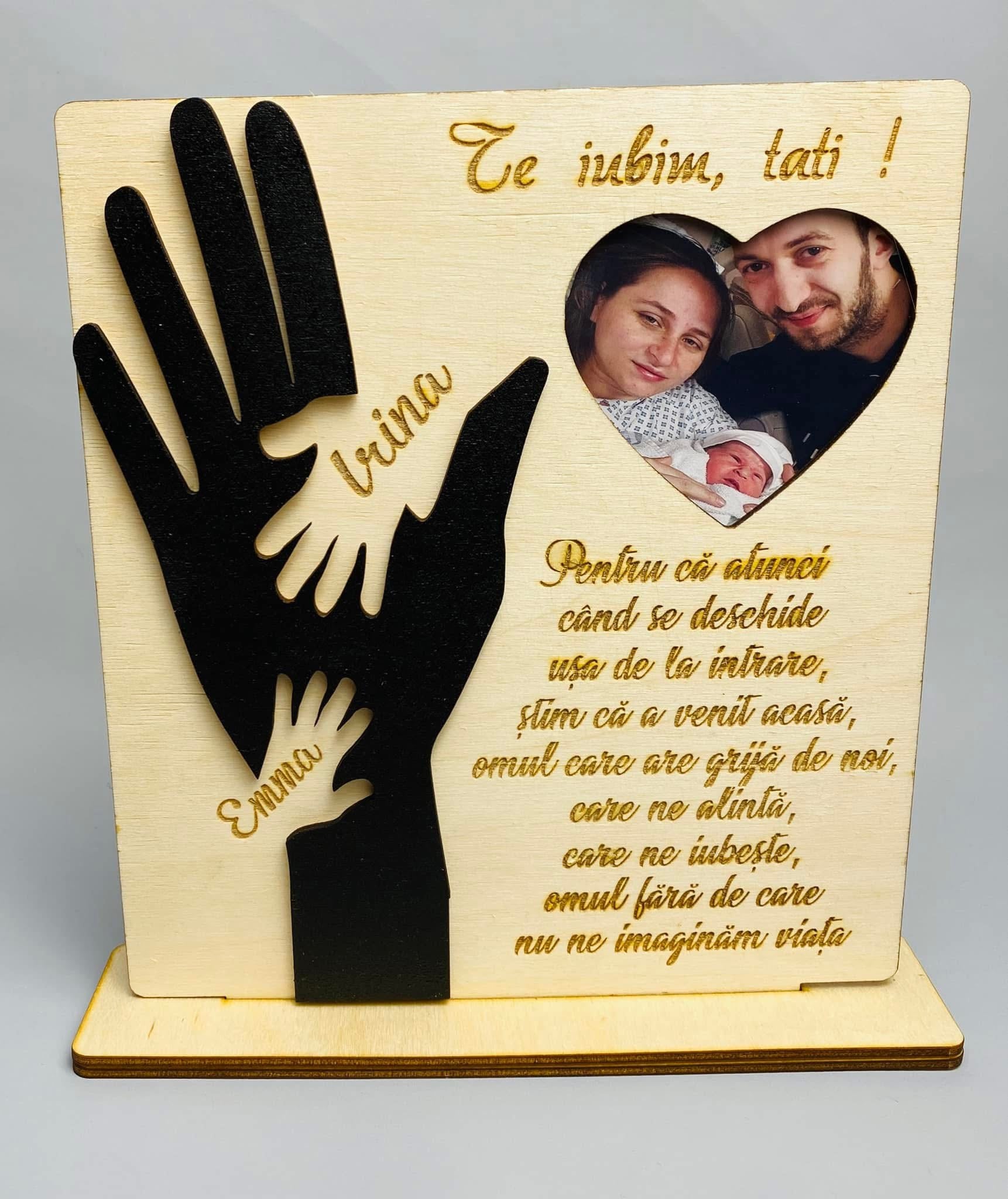 Un cadou emoționant care surprinde iubirea și legătura de familie într-un mod unic. Această ramă din lemn realizată cu grijă include un design de mână tăiat cu laser, nume gravate și un mesaj personalizat, plus spațiu pentru o fotografie în formă de inimă, fiind astfel un suvenir perfect pentru tati, mami sau bunici.