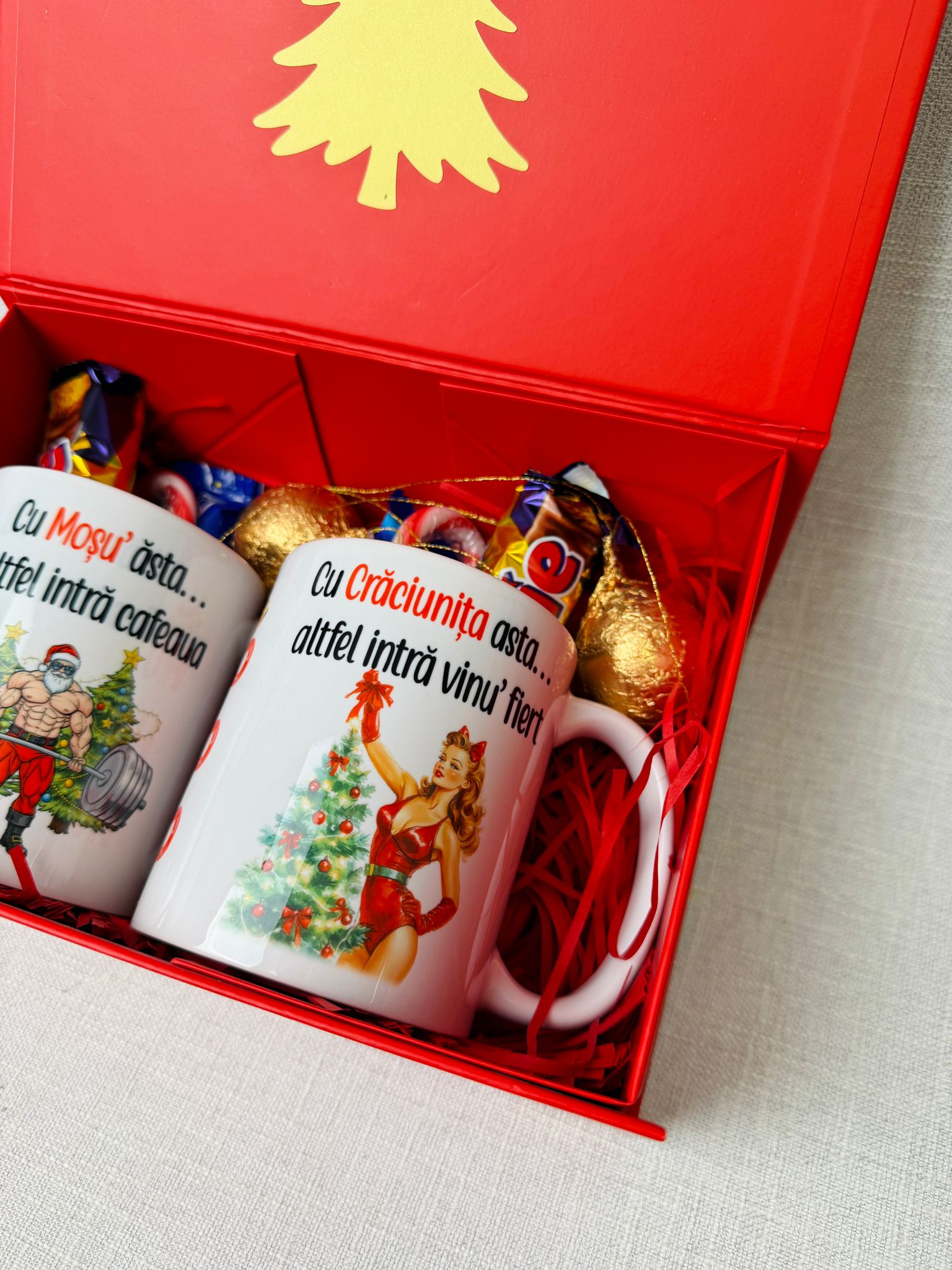 Acest set include două căni din ceramică personalizate și umplute cu dulciuri.
