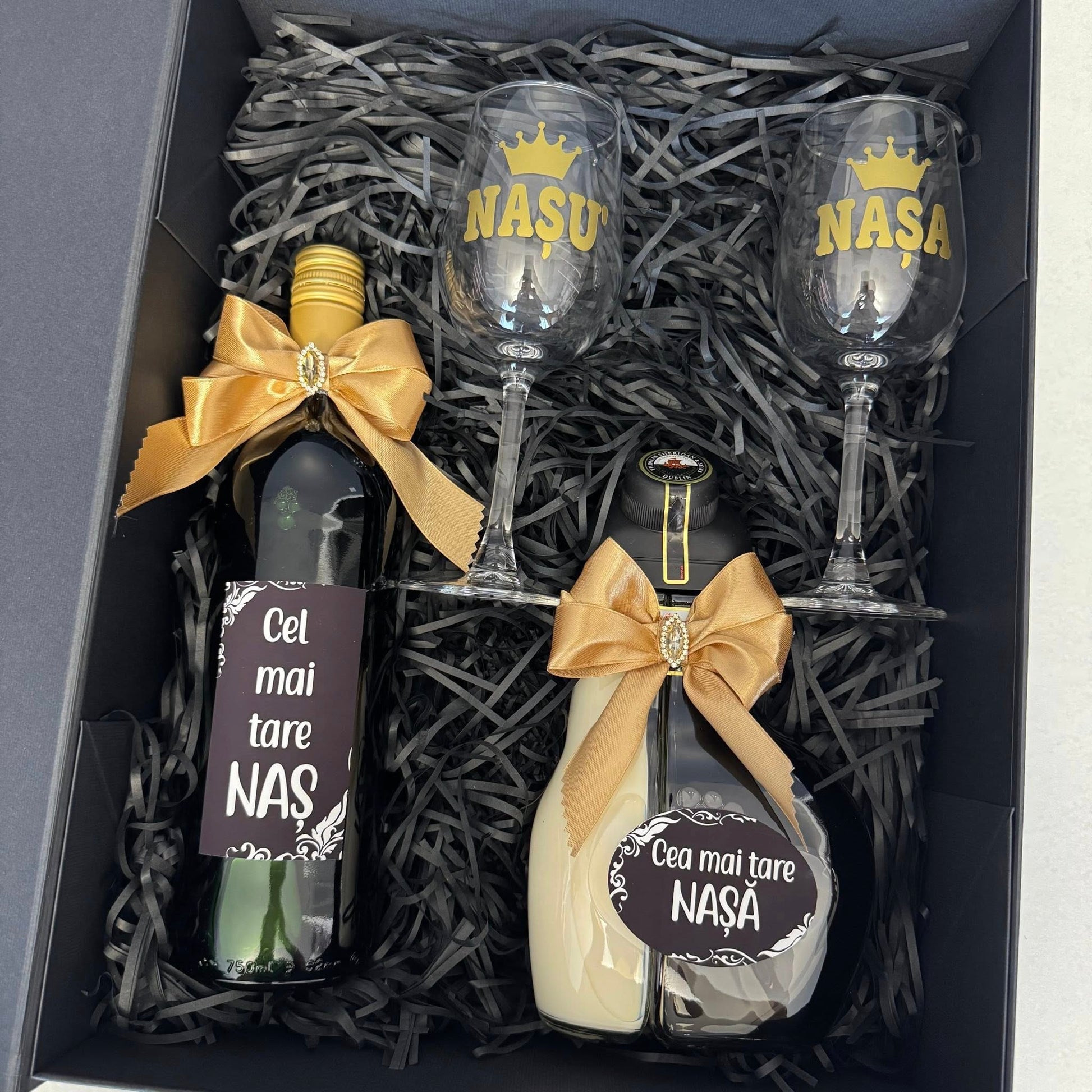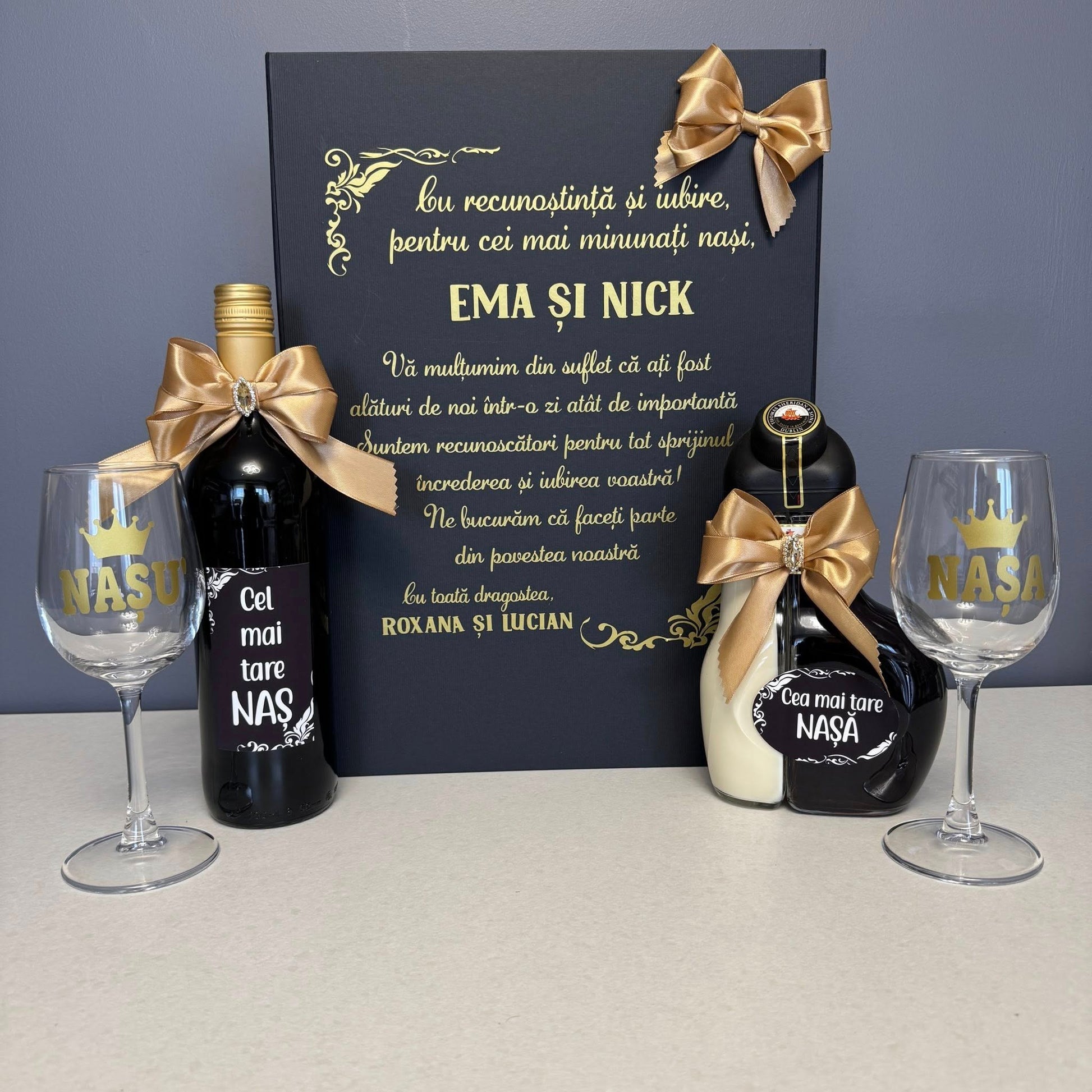 Acest set este perfect pentru a oferi un cadou elegant și personalizat nașilor. Puteți adăuga mesaje speciale pe cutie, pe sticlă sau pe pahare, astfel încât fiecare element să fie unic și memorabil.