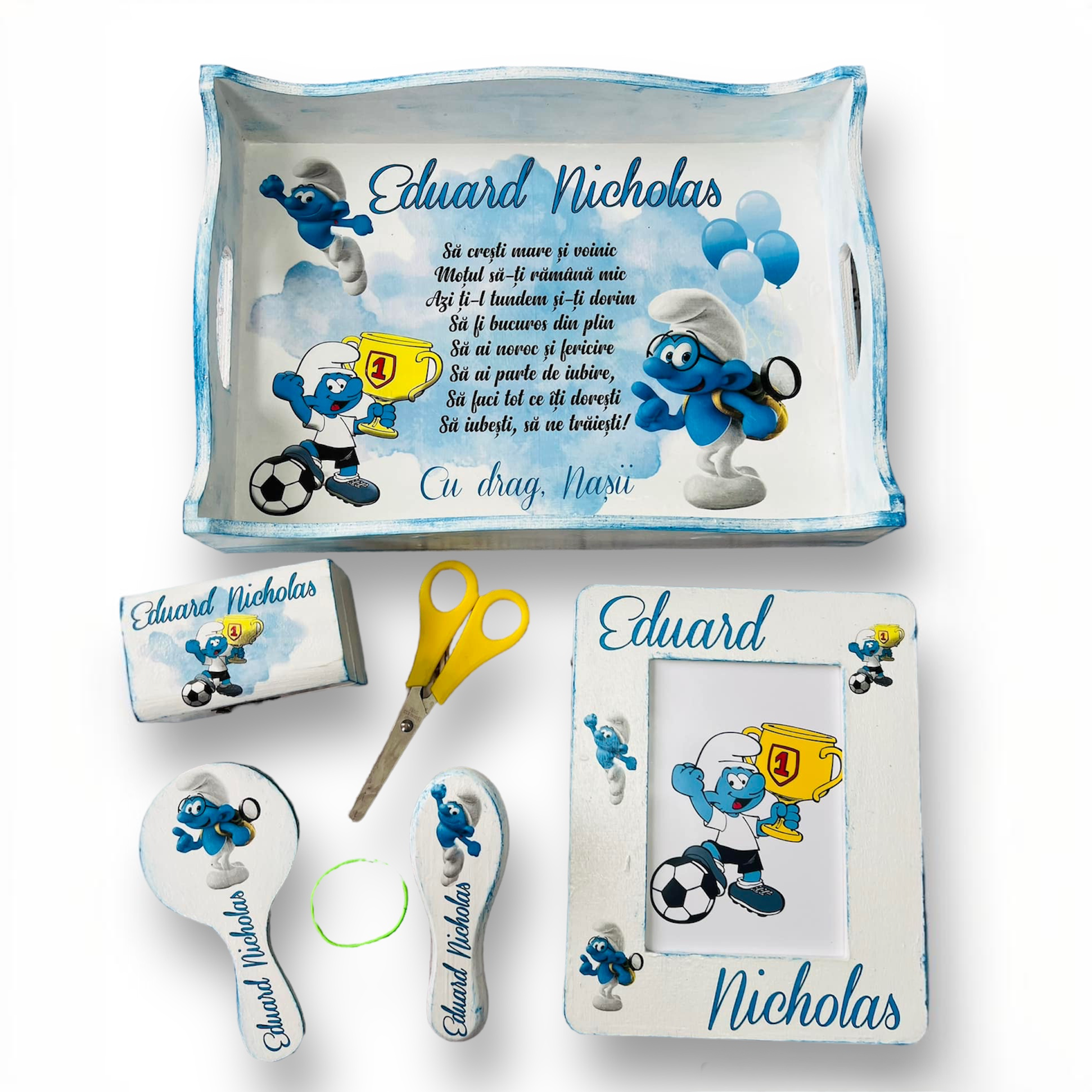 Acest set de moț conține toate piesele esențiale pentru tăierea moțului: tavă, foarfecă, cutiuță pentru șuviță, perie, oglindă, ramă foto și elastic de moț. Fiecare element este realizat cu atenție, pentru ca momentul special al copilului să fie magic și memorabil.