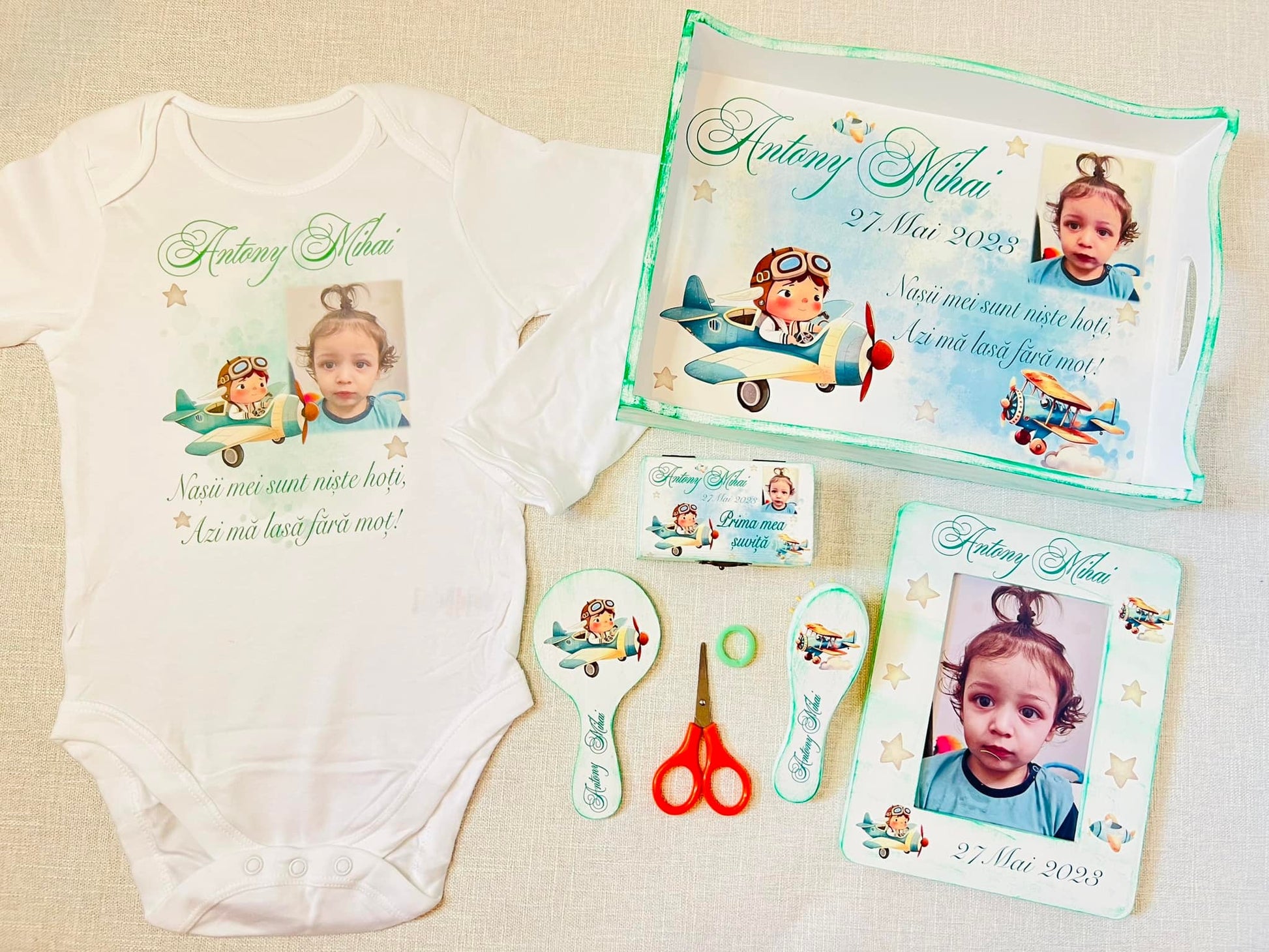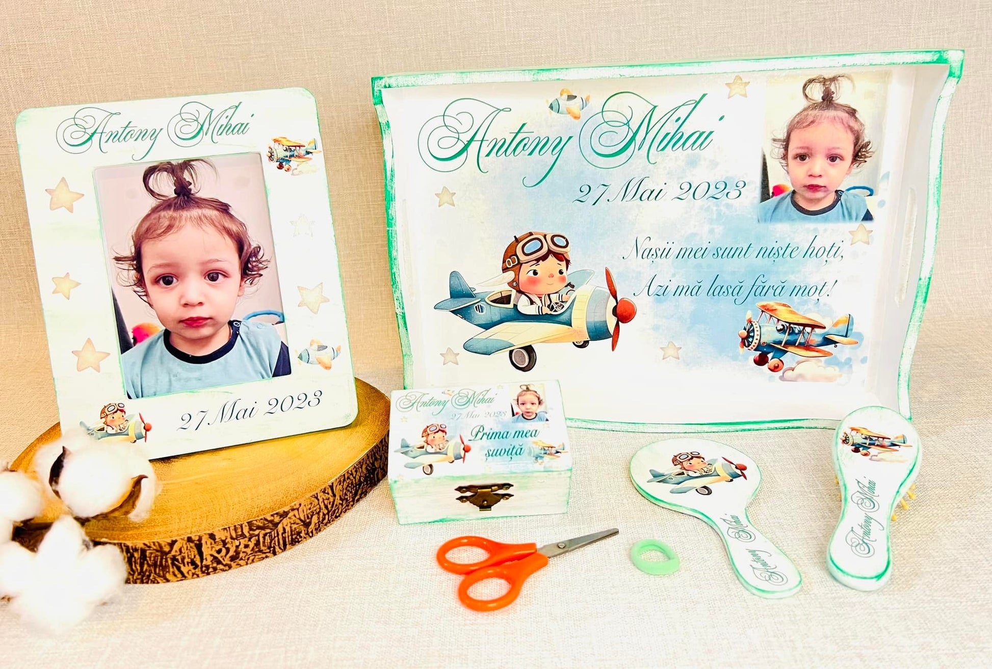Acest set de moț conține toate piesele esențiale pentru tăierea moțului: tavă, foarfecă, cutiuță pentru șuviță, perie, oglindă, ramă foto și elastic de moț. Fiecare element este realizat cu atenție, pentru ca momentul special al copilului să fie magic și memorabil.