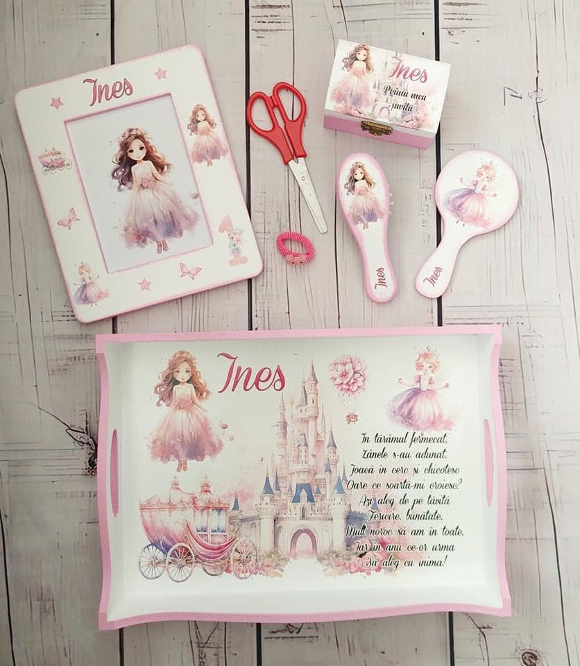 Acest set de moț conține toate piesele esențiale pentru tăierea moțului: tavă, foarfecă, cutiuță pentru șuviță, perie, oglindă, ramă foto și elastic de moț. Fiecare element este realizat cu atenție, pentru ca momentul special al copilului să fie magic și memorabil.