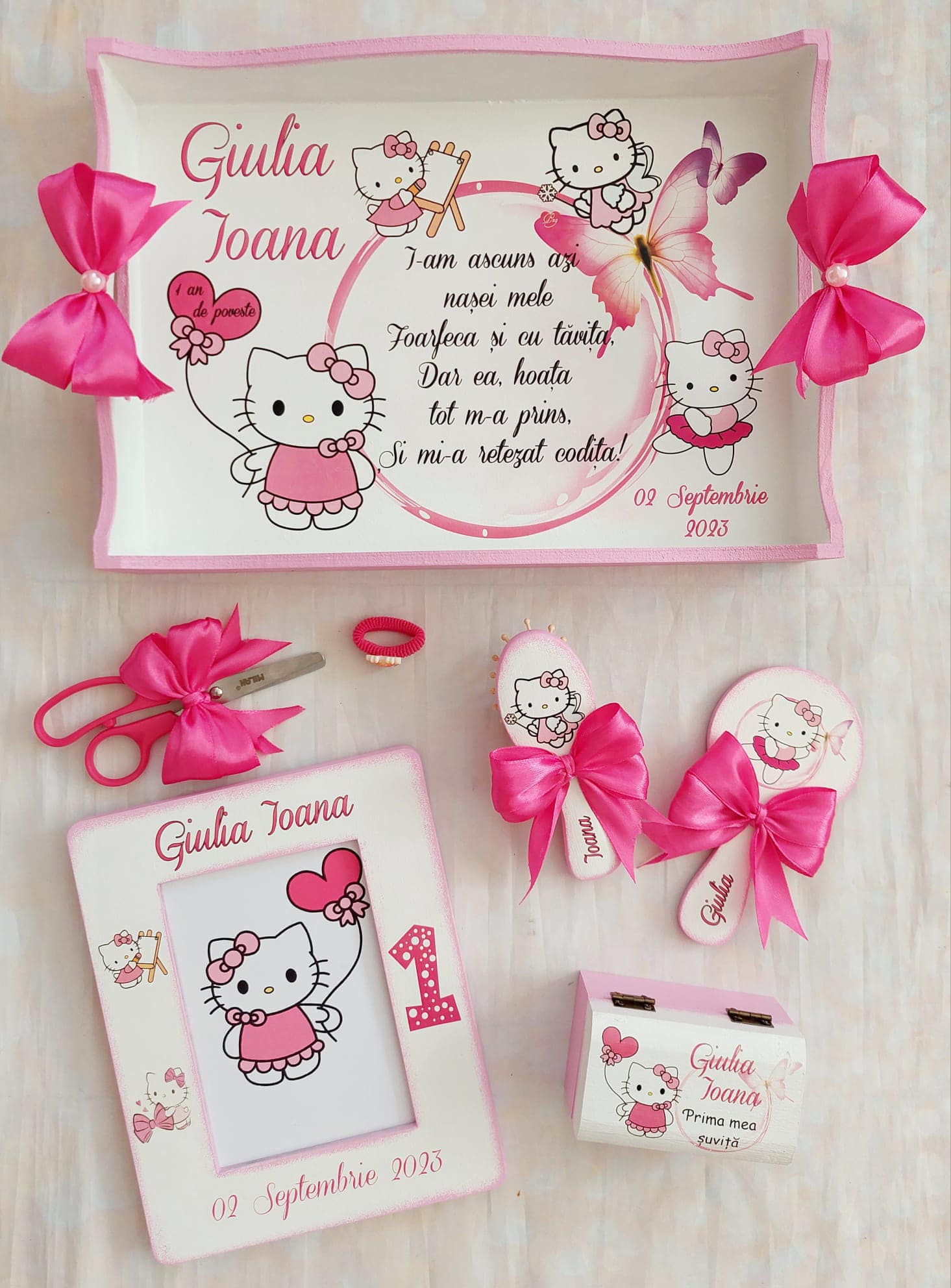 Acest set de moț conține toate piesele esențiale pentru tăierea moțului: tavă, foarfecă, cutiuță pentru șuviță, perie, oglindă, ramă foto și elastic de moț. Fiecare element este realizat cu atenție, pentru ca momentul special al copilului să fie magic și memorabil.