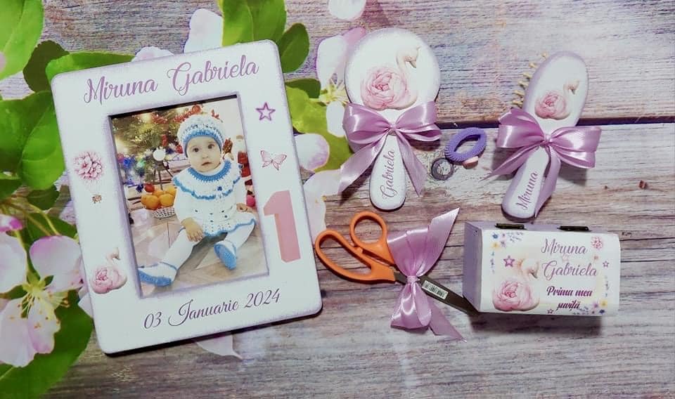 Acest set de moț conține toate piesele esențiale pentru tăierea moțului: tavă, foarfecă, cutiuță pentru șuviță, perie, oglindă, ramă foto și elastic de moț. Fiecare element este realizat cu atenție, pentru ca momentul special al copilului să fie magic și memorabil.