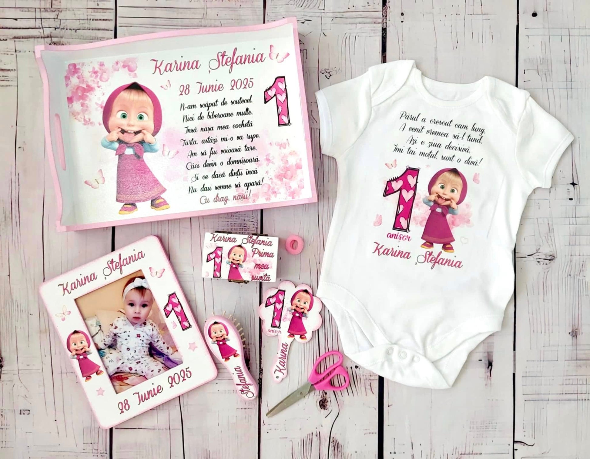 Acest set de moț conține toate piesele esențiale pentru tăierea moțului: tavă, foarfecă, cutiuță pentru șuviță, perie, oglindă, ramă foto și elastic de moț. Fiecare element este realizat cu atenție, pentru ca momentul special al copilului să fie magic și memorabil.