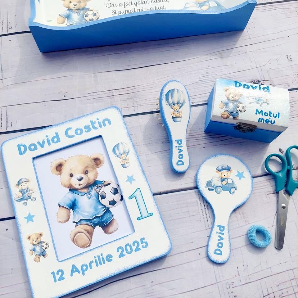 Acest set de moț conține toate piesele esențiale pentru tăierea moțului: tavă, foarfecă, cutiuță pentru șuviță, perie, oglindă, ramă foto și elastic de moț. Fiecare element este realizat cu atenție, pentru ca momentul special al copilului să fie magic și memorabil.