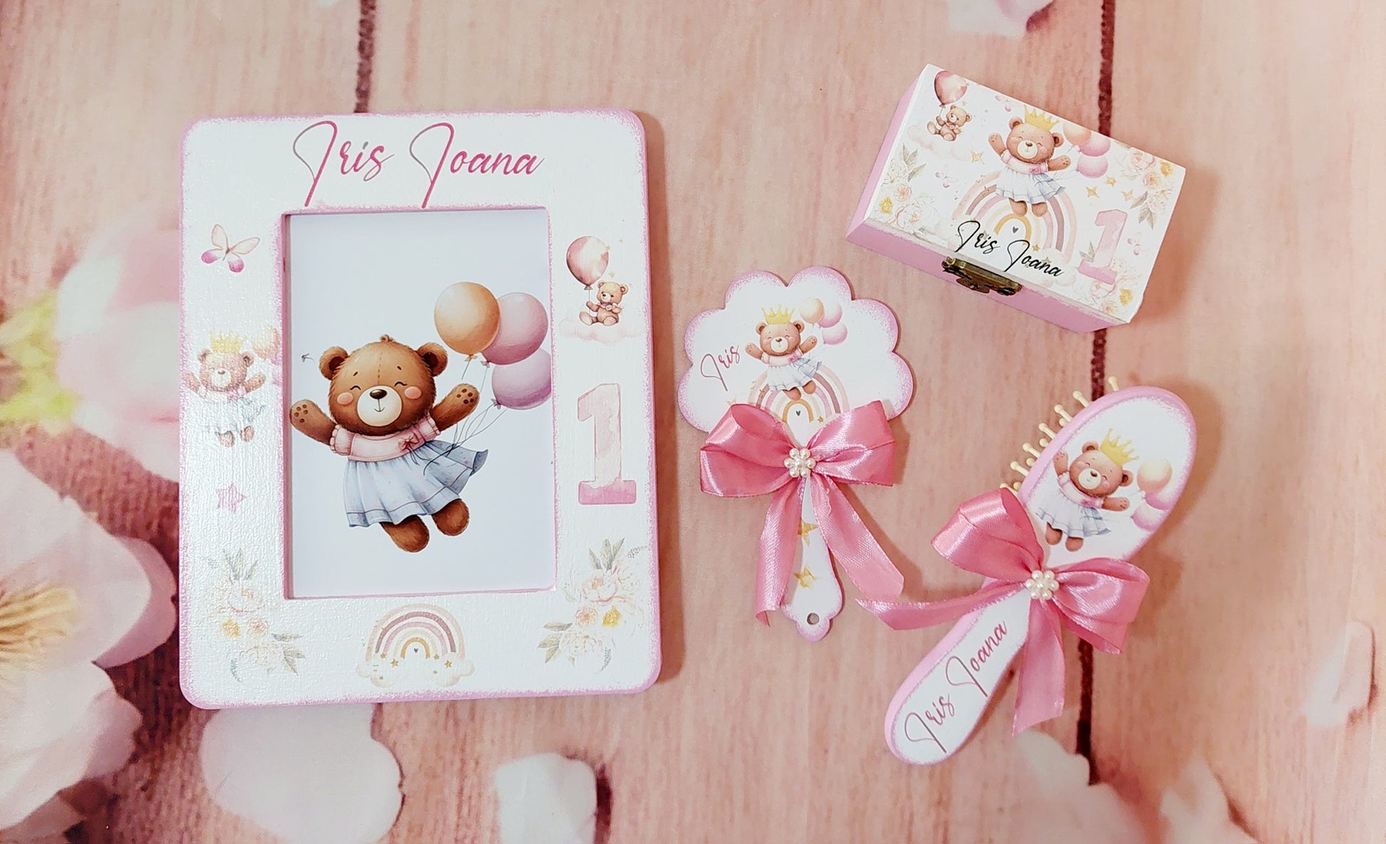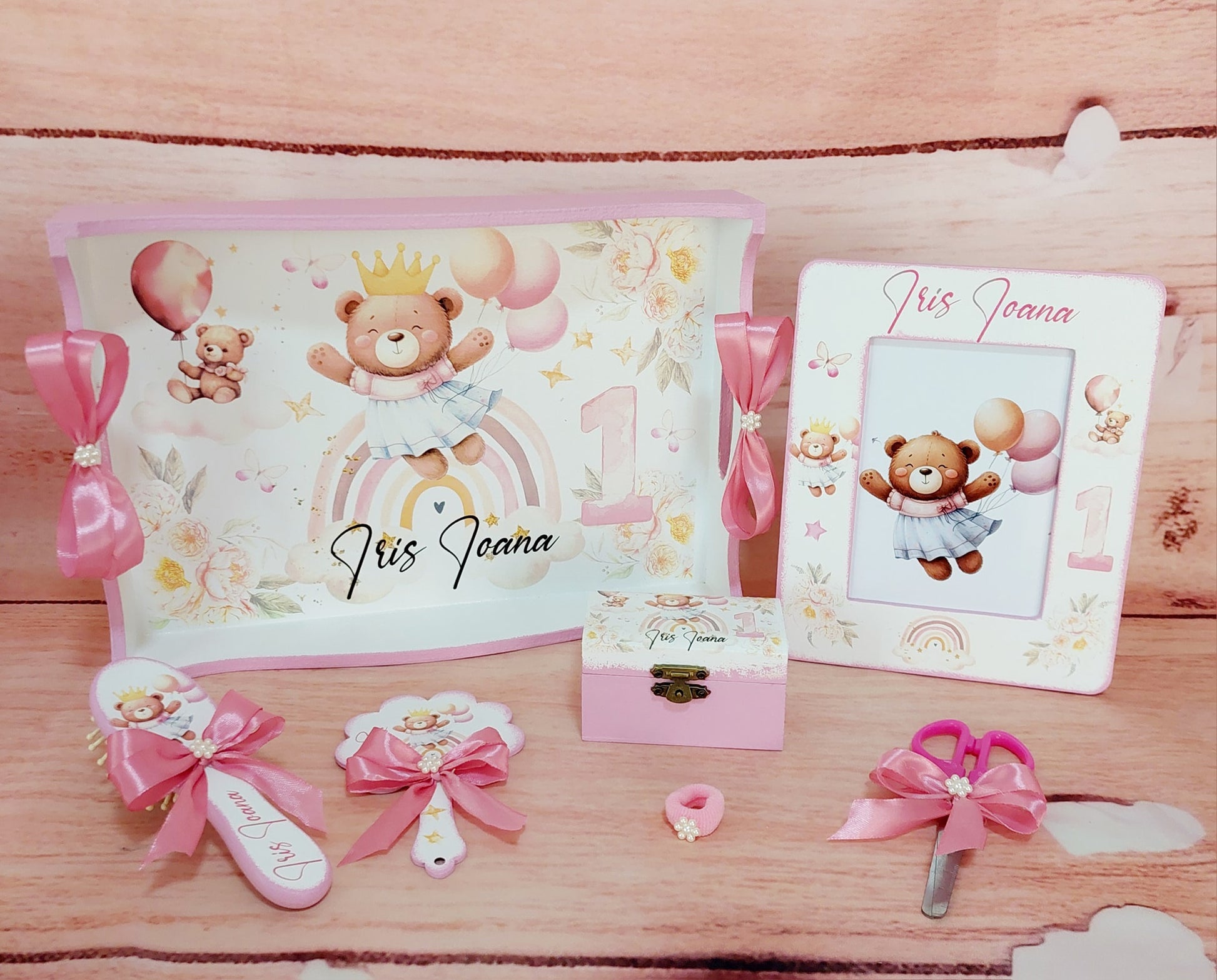 Acest set de moț conține toate piesele esențiale pentru tăierea moțului: tavă, foarfecă, cutiuță pentru șuviță, perie, oglindă, ramă foto și elastic de moț. Fiecare element este realizat cu atenție, pentru ca momentul special al copilului să fie magic și memorabil.