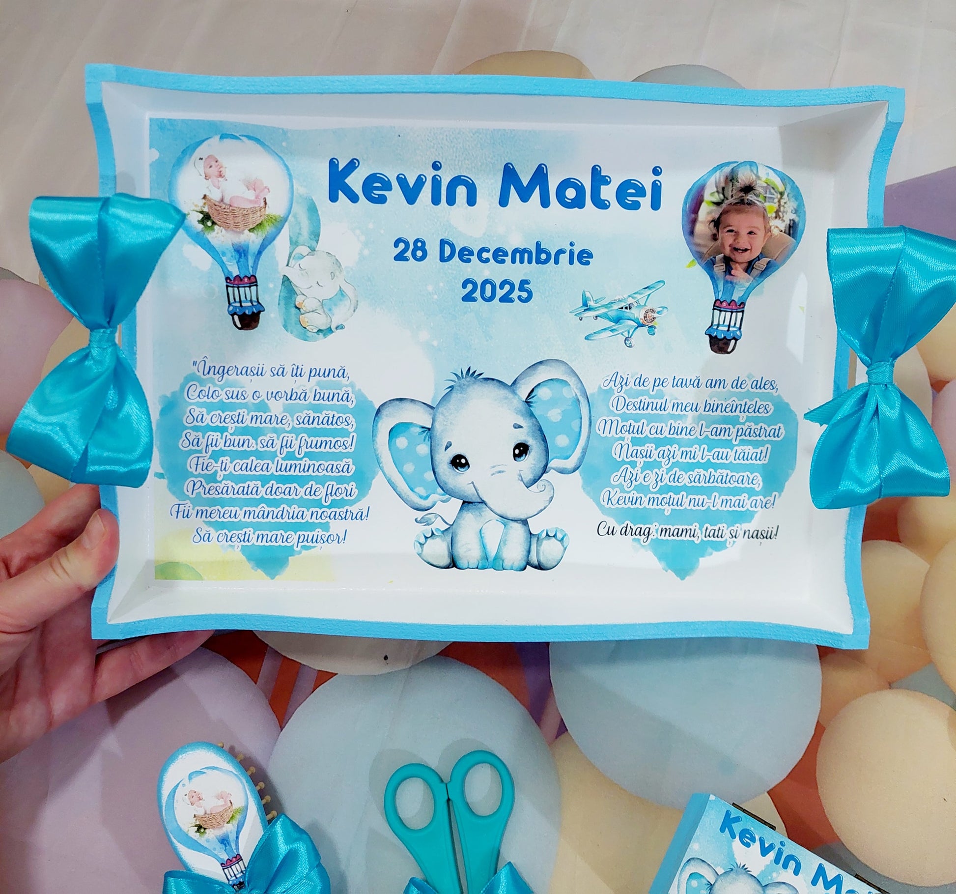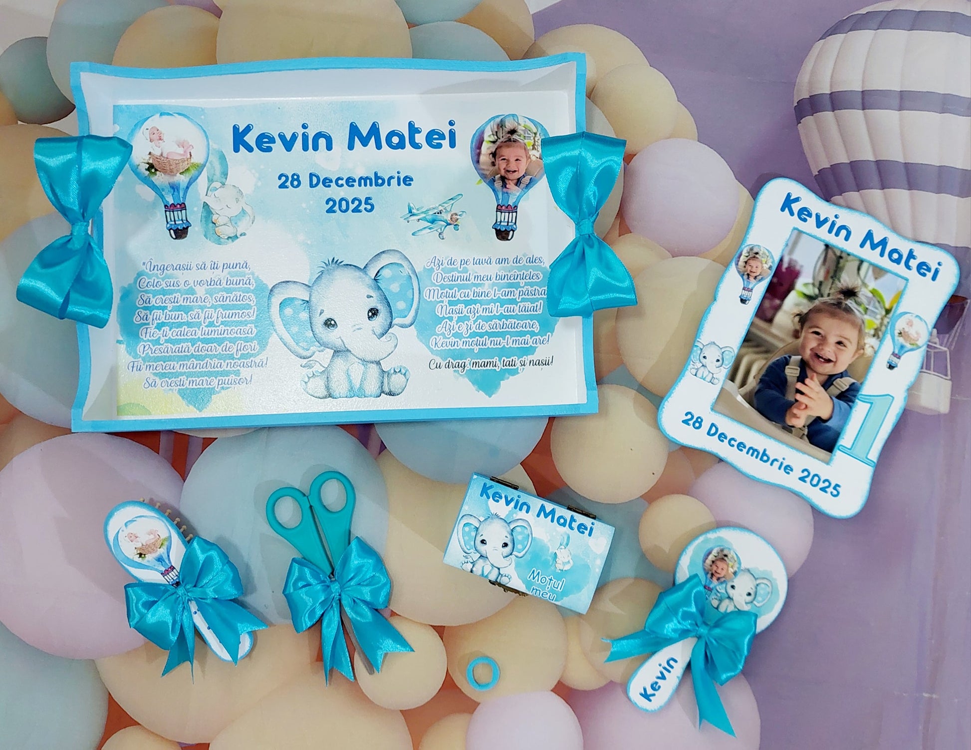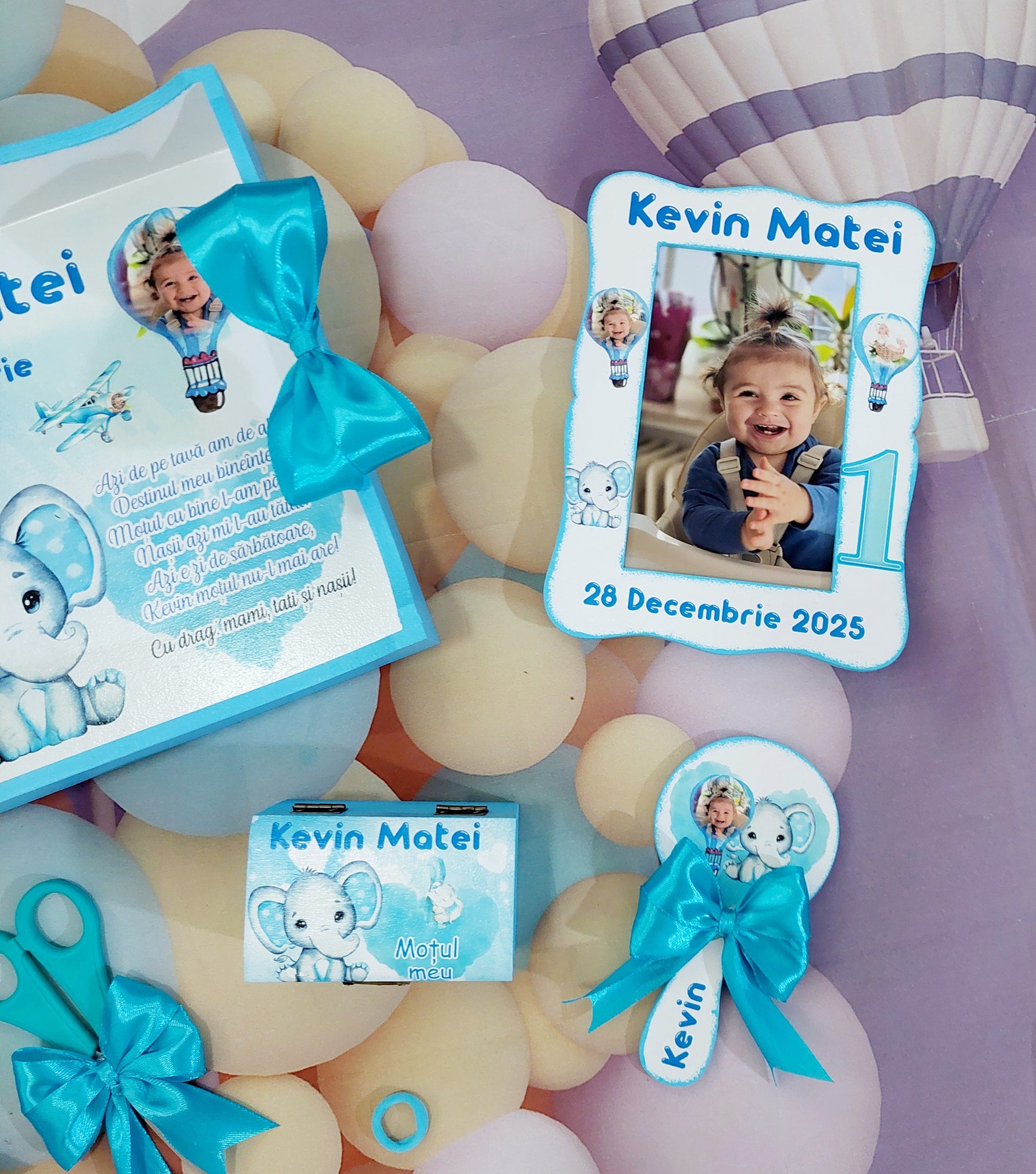 Acest set de moț conține toate piesele esențiale pentru tăierea moțului: tavă, foarfecă, cutiuță pentru șuviță, perie, oglindă, ramă foto și elastic de moț. Fiecare element este realizat cu atenție, pentru ca momentul special al copilului să fie magic și memorabil.